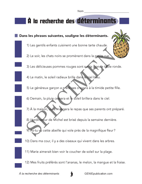 À l'intérieur des phrases proposées, l'élève doit repérer et souligner les déterminants.