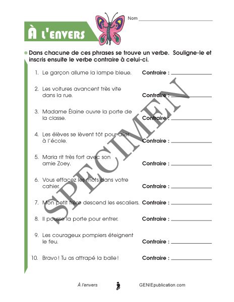 Dans cet exercice, l'enfant devra repérer le verbe dans les phrases proposées. Il devra ensuite trouver le verbe contraire à celui-ci.