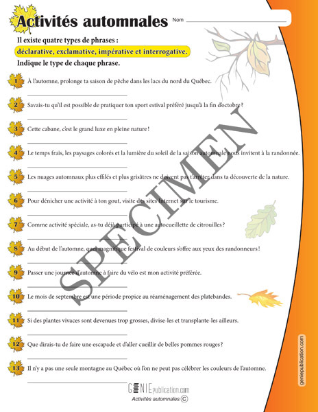 Pour chaque phrase sur le thème de l'automne, l'élève doit indiquer le type de phrase.