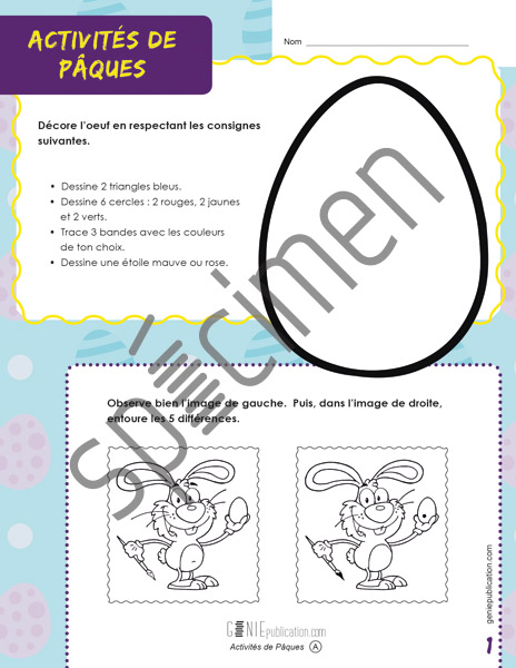 L'élève doit réaliser de courtes activités sur le thème de Pâques : décorer un œuf en respectant les consignes, trouver les différences entre deux images et découvrir un mot caché.