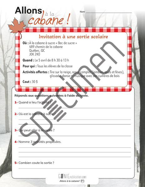 L’élève lit une invitation à une sortie scolaire : la cabane à sucre ! Ensuite, il répond à 5 questions qui lui permettront de pratiquer les mots interrogatifs (quand, où, qui, quoi, combien).
