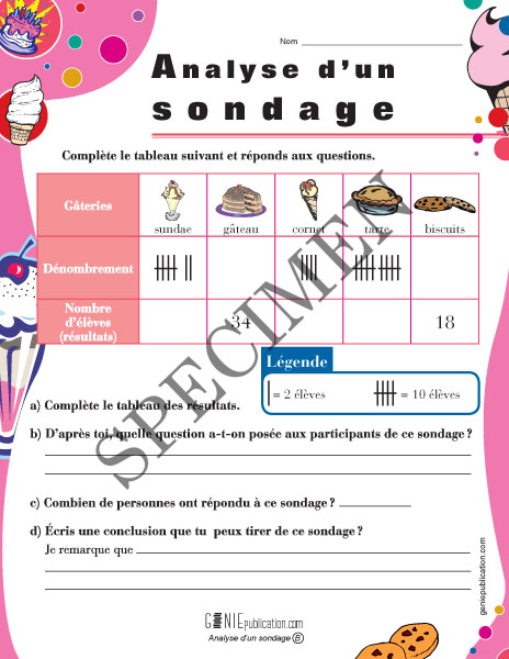 L'élève doit analyser et compléter un tableau contenant les réponses d'un sondage. Il doit ensuite répondre à des questions par rapport à ce tableau.