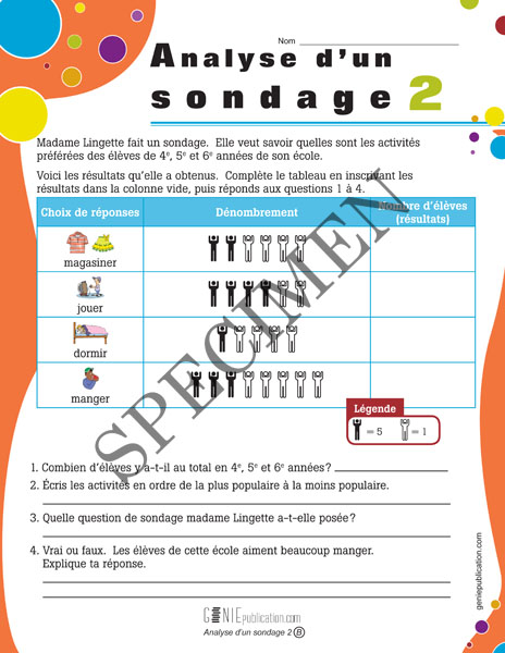 L'élève doit interpréter les résultats d'un sondage fictif en répondant à des questions.