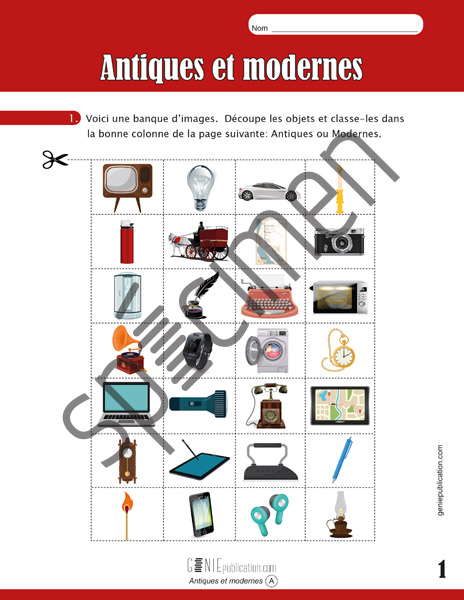 Dans cette activité, l’élève doit découper des objets et les classer dans les bonnes colonnes : Antiques ou Modernes. Ensuite, il imagine deux de ces objets dans le futur. Puis, il précise lesquels des objets antiques il aurait aimé utiliser.