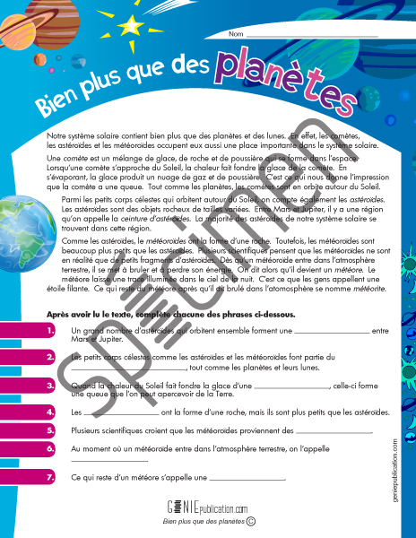 L'élève doit lire un texte au sujet des comètes, des astéroïdes et des météoroïdes afin de compléter des phrases trouées.