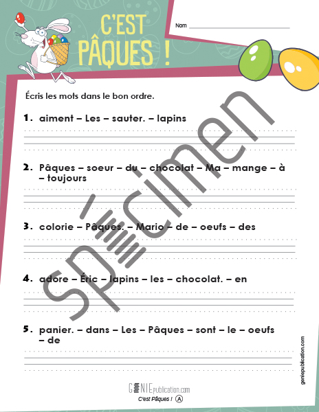 L'élève doit remettre des mots en ordre pour former des phrases sur le thème de Pâques.