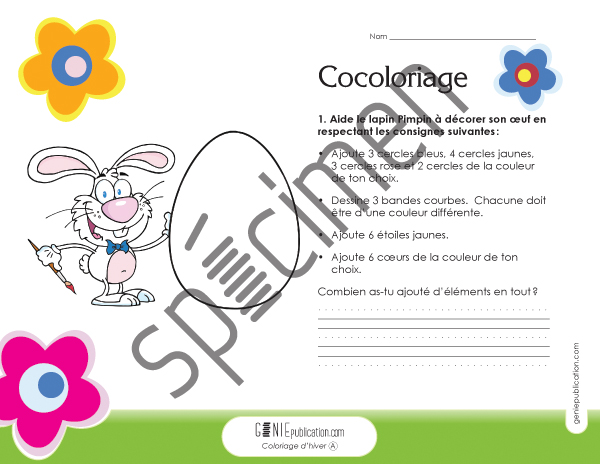 L'élève doit compléter un dessin en respectant diverses consignes liées aux couleurs et aux nombres.