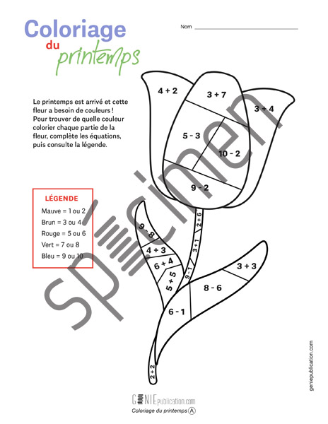 Le printemps est arrivé ! L’élève complète des équations mathématiques simples (additions et soustractions), puis il colorie chaque partie de la fleur selon la légende.