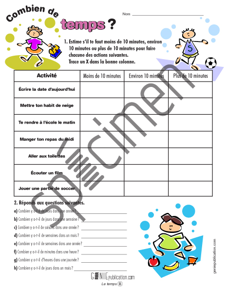 L'élève doit estimer le temps requis pour accomplir différentes activités. Par la suite, l'élève doit répondre à différentes questions concernant les unités de temps.