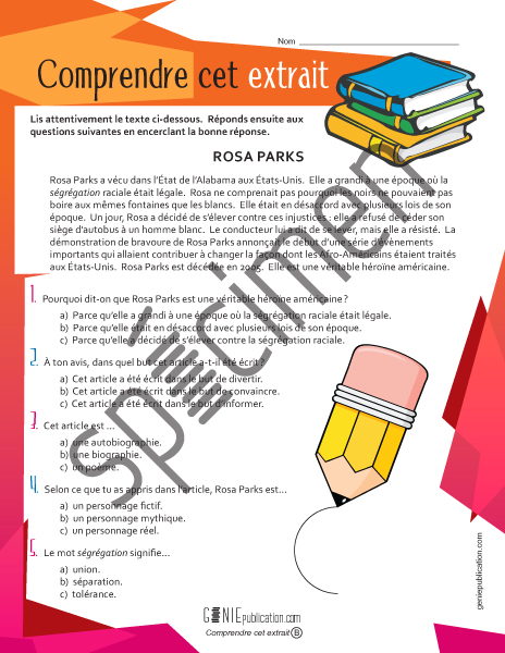 L'élève doit lire un court article à propos de Rosa Parks et répondre à des questions à choix multiples.