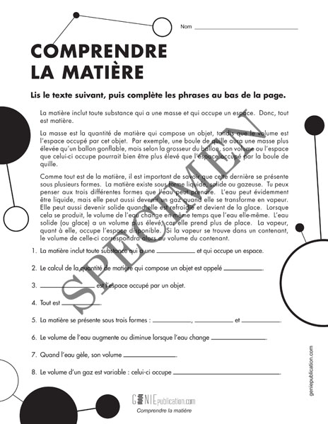 L'élève doit compléter diverses phrases à l'aide de l'information se trouvant dans un texte sur la matière et ses caractéristiques.