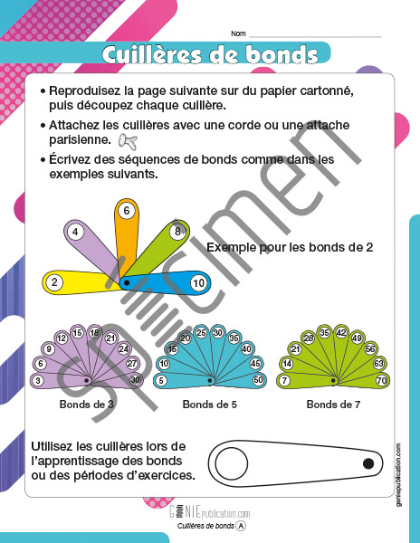 L'enseignant ou l'enseignante peut utiliser les cuillères de bonds lors de l'apprentissage des bonds ou des périodes d'exercices. Il ou elle peut en préparer plusieurs de chaque type de bonds pour que les élèves puissent utiliser celui dont ils ont besoin.