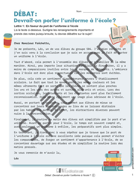 Dans cette activité, les élèves devront débattre sur le sujet du port de l’uniforme à l’école à l’aide de deux lettres écrites par des élèves à leur enseignant et enseignante. Pour ce faire, un élève ou un groupe d’élèves lit la première lettre, qui est en faveur du port de l’uniforme, tandis qu’un autre élève ou groupe d’élèves lit la seconde lettre, qui s’y oppose. Pendant la lecture, les élèves prennent des notes, puis le débat commence ! En s’appuyant sur les renseignements recueillis lors de la lecture, les élèves argumentent et discutent sur le sujet du port de l’uniforme à l’école. Pour terminer, l’élève ou le groupe d’élèves doit faire un résumé des arguments qui sont contraires à ceux du texte lu.
