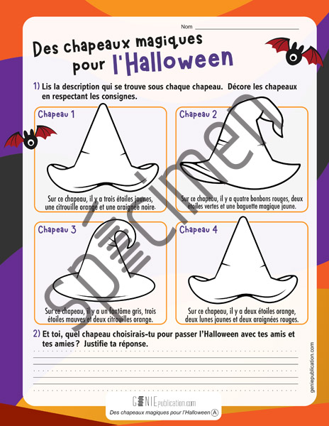 Joyeuse Halloween ! Dans cette activité, l’élève décore quatre chapeaux de sorcière selon leur description. Ensuite, il choisit son chapeau préféré et explique son choix.