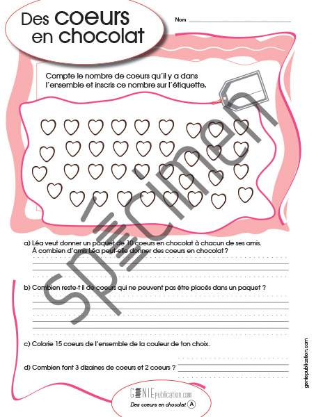 L'élève doit dénombrer la collection de cœurs en chocolat. Il doit ensuite répondre aux questions.