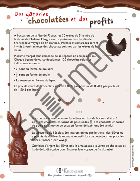 Dans cette activité sur le thème de Pâques, l’élève doit calculer les profits qu’ont amassés les élèves de 5e année de la classe de Madame Margot en vendant des chocolats pour financer leur voyage de fin d’année. L’élève mettra en pratique ses savoirs sur les fractions, les additions, les soustractions, les divisions et les multiplications.