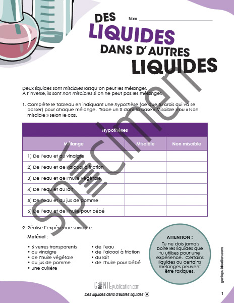 L'élève doit réaliser une expérience sur la miscibilité de certains liquides dans l'eau.