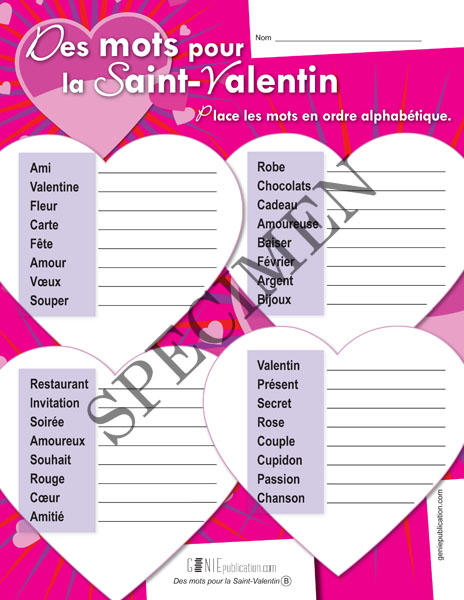 L’élève doit placer en ordre alphabétique quatre listes de mots sur le thème de la Saint-Valentin.