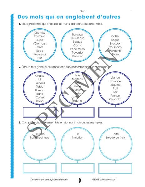 Les enfants doivent d'abord trouver le mot générique qui regroupe le mieux des ensembles, puis compléter d'autres ensembles avec des mots génériques.