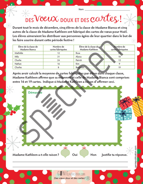 Madame Kathleen affirme que les moyennes des cartes fabriquées par ses élèves et des cartes fabriquées par les élèves de Madame Bianca sont comprises entre 16 et 19. Dans cette activité, l’élève doit déterminer si cette affirmation est vraie ou fausse.