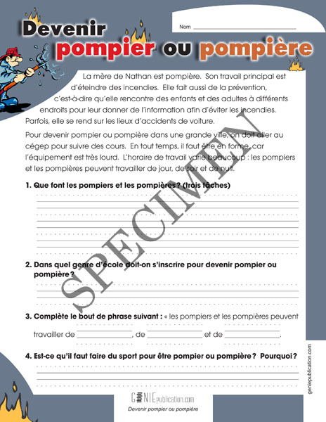 La mère de Nathan est pompière. Après avoir lu le texte expliquant le métier de celle-ci, l'élève devra répondre à quelques questions.