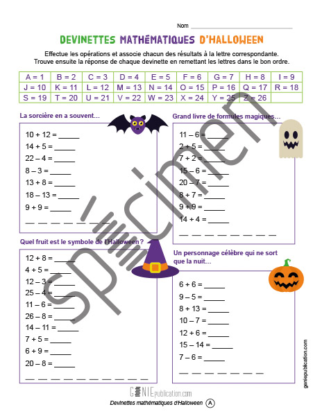 L'élève doit effectuer des additions et des soustractions. Le résultat de chaque équation est associé à une lettre. Les lettres sont ensuite utilisées pour former un mot.