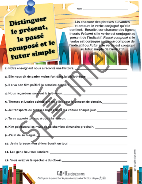 L'élève doit entourer le verbe conjugué dans différentes phrases et indiquer si celui-ci est au présent de l'indicatif au futur simple ou au passé composé de l'indicatif.