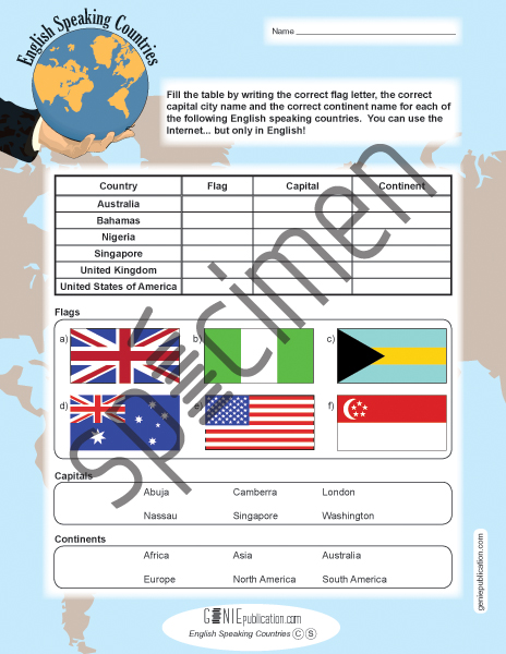 L'élève doit utiliser l'Internet (en anglais) pour trouver des informations au sujet de différents pays dont l'une des langues officielles est l'anglais.