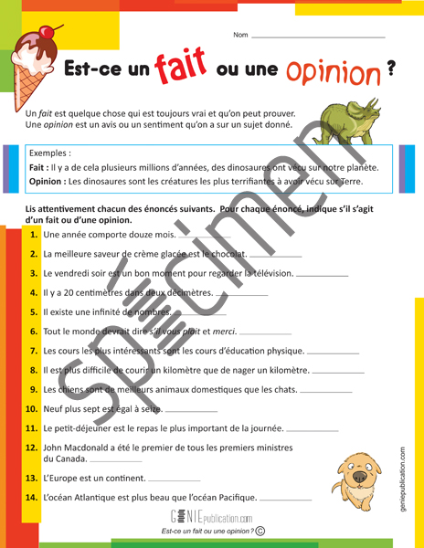L'élève doit lire des énoncés et indiquer s'il s'agit de faits ou d'opinions.