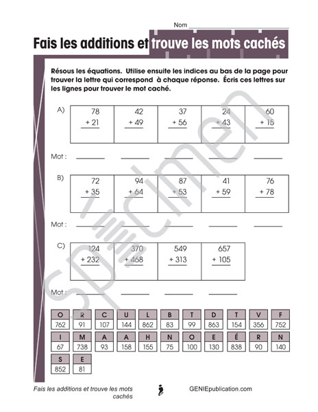 L'élève doit effectuer des additions et, à l'aide d'indices, associer chaque réponse à une lettre pour découvrir des mots cachés.