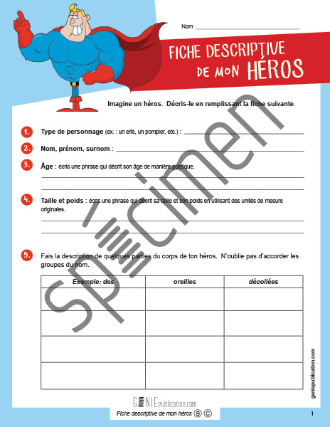 L'élève doit imaginer un héros et remplir une fiche descriptive sur celui-ci en respectant des consignes d'écriture particulières.