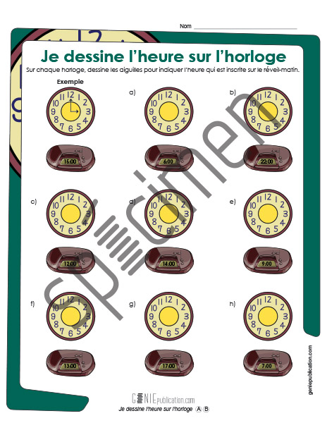 L'élève s'exerce à tracer les aiguilles sur l'horloge pour indiquer l'heure demandée.