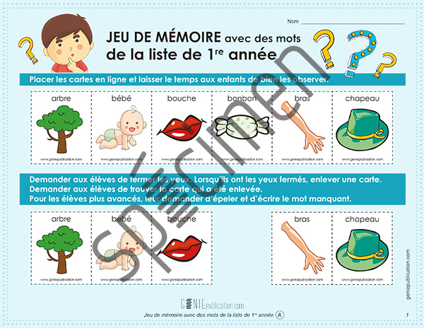 Après avoir découpé les mots, on les place en ligne. Ensuite, on demande à l'enfant d'identifier et de remarquer les mots présentés. Finalement, l'élève ferme les yeux. On enlève un mot et il essaie de trouver le mot manquant.