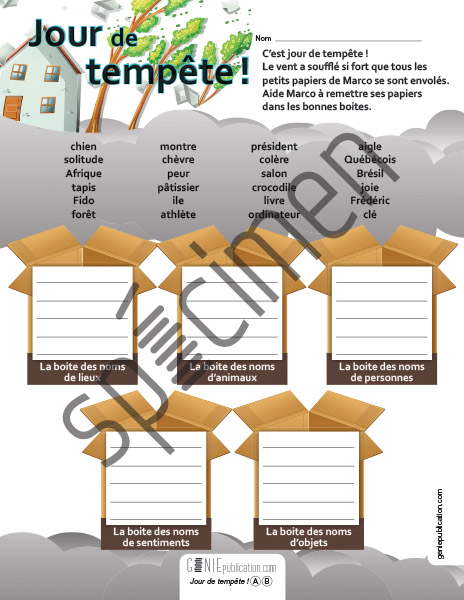 L'élève doit classer des noms selon ce qu'ils désignent : un lieu, une personne, un animal, un sentiment ou un objet.