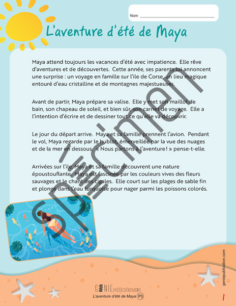 L’élève lit une histoire qui raconte le voyage de Maya et sa famille sur l’ile de Corse. Ensuite, il répond à 11 questions.