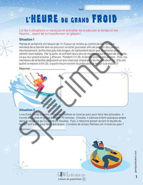 Dans cette activité sur le thème de l’hiver, l’élève lit 4 situations et s’entraine à calculer les heures, les minutes et le temps.