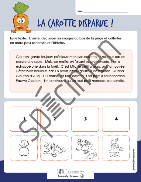 L'élève lit une courte histoire. Il doit ensuite placer quatre images dans l'ordre pour reconstituer l'histoire.