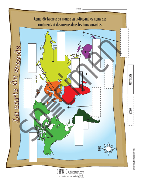 L'élève doit compléter une carte du monde en inscrivant les noms des continents et des océans aux endroits appropriés.