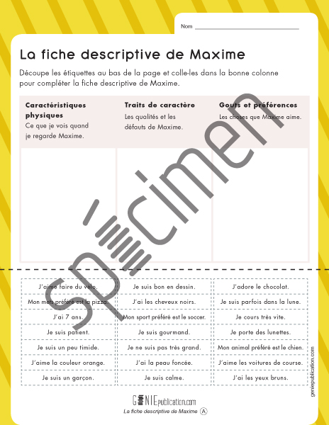 L'élève doit découper des étiquettes et les coller aux bons endroits afin de compléter la fiche descriptive d'un personnage fictif.