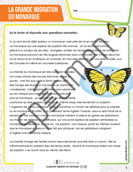 L'élève doit lire un texte sur les monarques et leur migration, puis il doit répondre à des questions.