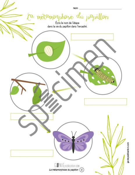 L'élève doit trouver les noms des étapes de la vie d'un papillon.