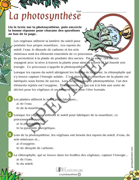 Composée d'un petit texte informatif suivi de quatre exercices de compréhension, cette activité permet à l'élève d'apprendre la base du processus de la photosynthèse.