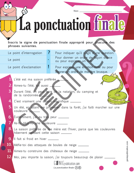 Les élèves doivent déterminer le signe de ponctuation finale approprié pour les phrases.