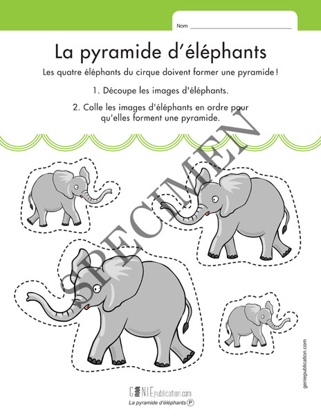 L’enfant doit découper des images d’éléphants et les coller pour former une pyramide.