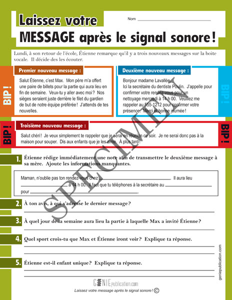 L'élève doit répondre à des questions de compréhension et d'inférence après avoir lu les transcriptions de différents messages vocaux.