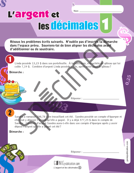 Les élèves doivent faire des résolutions de problèmes avec de l'argent et des décimales.