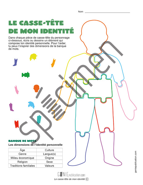 Dans chaque pièce de casse-tête de la silhouette, l’élève écrit ou dessine un élément qui compose son identité personnelle. Pour s’aider, il peut consulter la banque de mots qui contient certaines des dimensions de l’identité personnelle (âge, culture, genre, langue(s), etc.).