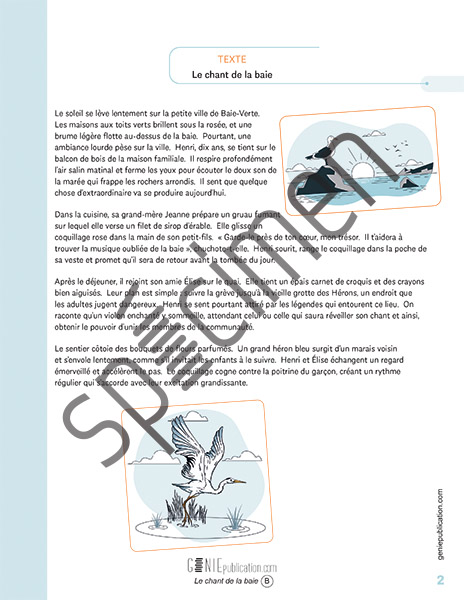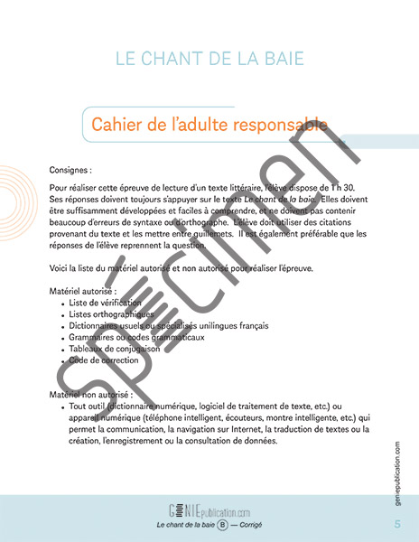 Le chant de la baie est un texte de 1 102 mots suivi de 12 questions (questions à choix multiples, d’ordonnancement, à réponse courte et à réponse élaborée). Cette activité a été conçue selon le modèle des épreuves et présente un cahier de l’élève (comprenant le texte Le chant de la baie et un cahier de réponses) ainsi qu’un cahier de l’adulte responsable (comprenant le corrigé).
