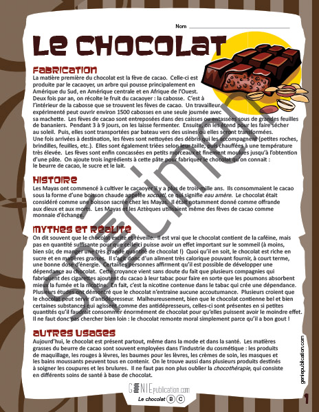 L'élève doit répondre à des questions de compréhension après avoir lu un texte sur le thème du chocolat.