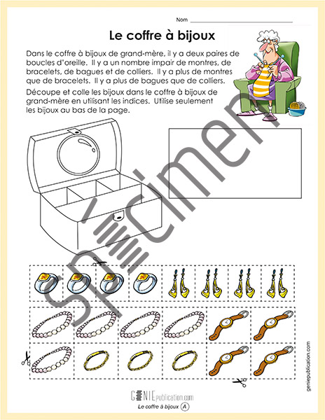 L'élève doit remplir le coffre à bijoux de sa grand-mère selon les indications.
